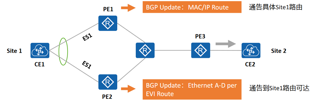 如图,PE1通过MAC/IP route路由将自己连接了CE1告知CE2,如此CE2就会按照通告的路由将下一跳指向PE1设备,这样就无法实现负载均衡。现在PE2因为也连接了CE1,他会使用A-D EVI路由告知PE3,本设备也连接了CE1,此时PE3就会认知到PE1与PE2都连接了CE1,这样转发的时候,PE3就可以分析形成负载均衡