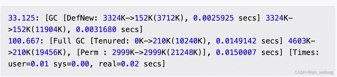 1.如果是ParNew收集器,新生代名称就会变为“[ParNew”,意为“Parallel New Generation”。如果采用Parallel Scavenge收集器,那它配套的新生代称为“PSYoungGen”,老年代和永久代同理,名称也是由收集器决定的