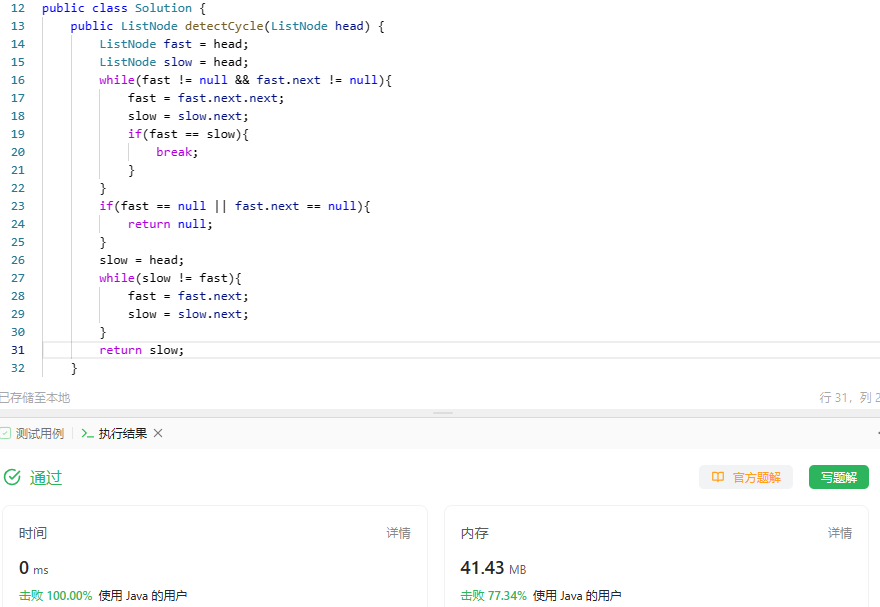 一般情况我们让fast走两步,slow走1步,这种情况最快相遇(因为最多一个环的长度内就能fast追上),每次走完就判断一次