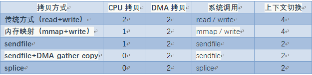下列表格从 CPU Copy 次数、DMA Copy 次数以及 SCI 次数这 3 个方面来对比了几种常见的零拷贝技术。可以看见,2 次 DMA Copy 是不可避免的,因为 DMA 是外设 I/O 的基本行为。零拷贝技术主要从减少 CPU Copy 和 CPU 模式切换这 2 个方面展开。