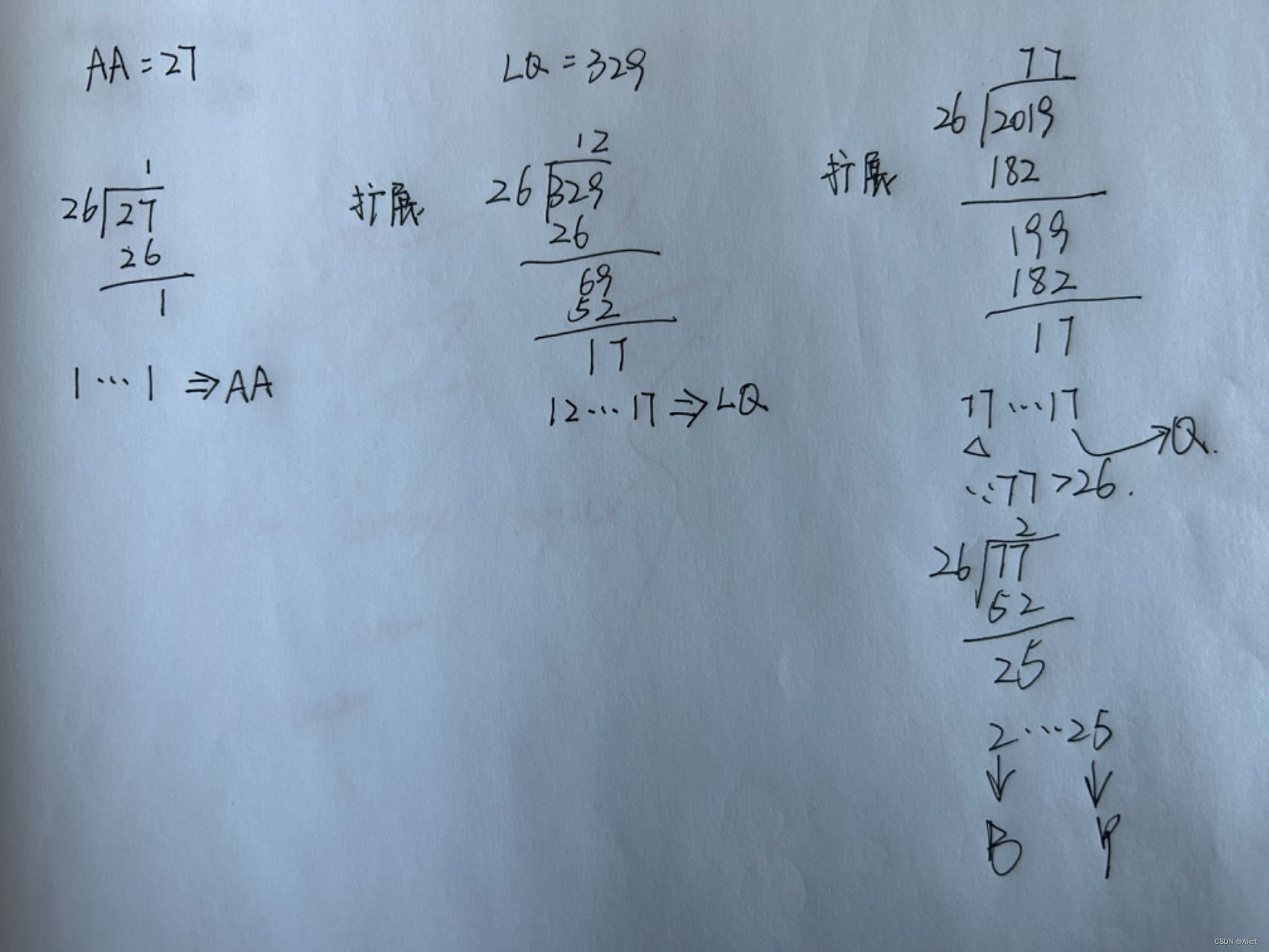 我们发现每个字母都与26紧密相关,其%26的位置就是最后一个字母,由于最开始将0做为了1故在写答案时需要注意细节问题