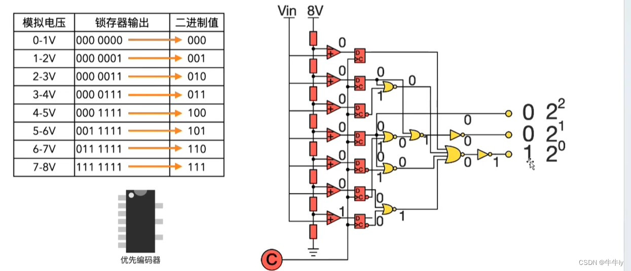Vin 大于 Vr 输出1 ,Vin 小于 Vr 输出0. 而Vin可以设置0~8v。每个比较器的Vr通过分压算出来。就可以控制比较器的输出。