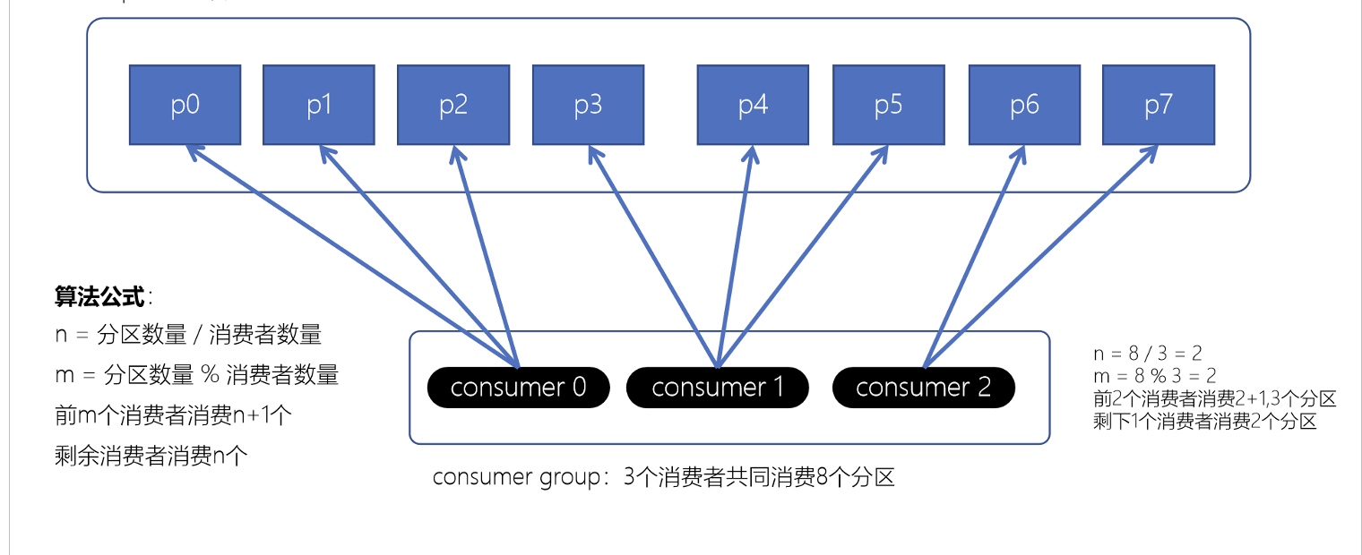 topic的分区会根据消费策略均匀的分配给消费组中的每个消费者。