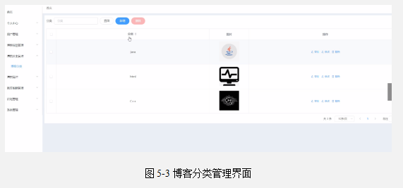 博客分类管理:管理员通过列表可以获取分类等信息,进行查看博客分类管理等信息操作内容等等并进行添加、删除、修改以及查看,如图5-3所示。