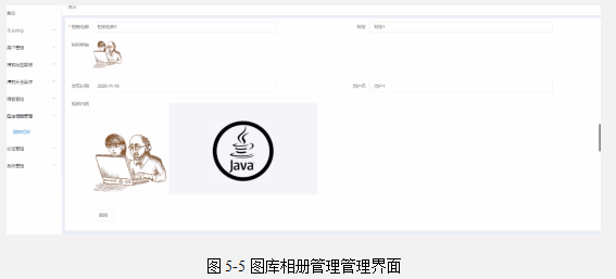 图库相册管理:管理员通过列表可以获取相册名称、标签、相册封面、发布日期、用户名等信息,进行查看图库相册等信息操作内容等等并进行添加、删除、修改以及查看,如图5-5所示。