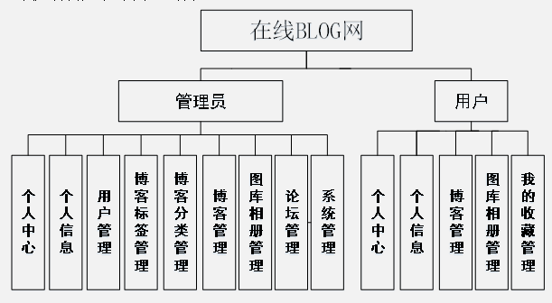 在线BLOG网,主要包括管理员、用户二个用户角色,对于用户角色不同,所使用的功能模块相应不同。
