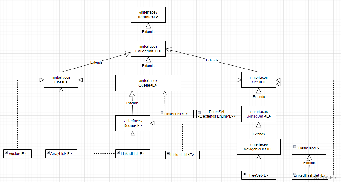 1.定义:Collection接口是最基本的集合接口,它不提供直接的实现,Java SDK提供的类都是继承自Collection的“子接口”如List,Set和Queue。Collection所代表的是一种规则,它所包含的元素都必须遵循一条或者多条规则。如有些允许出现重复元素而有些则不允许重复、有些必须要按照顺序插入而有些则是散列,有些支持排序但是有些则不支持等等