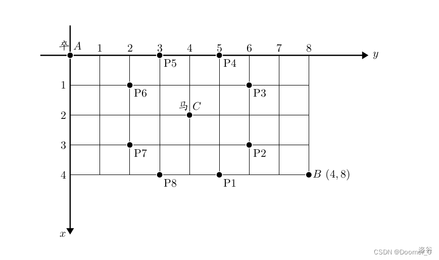 棋盘用坐标表示,A 点 (0, 0)、B$点 (n, m),同样马的位置坐标是需要给出的。