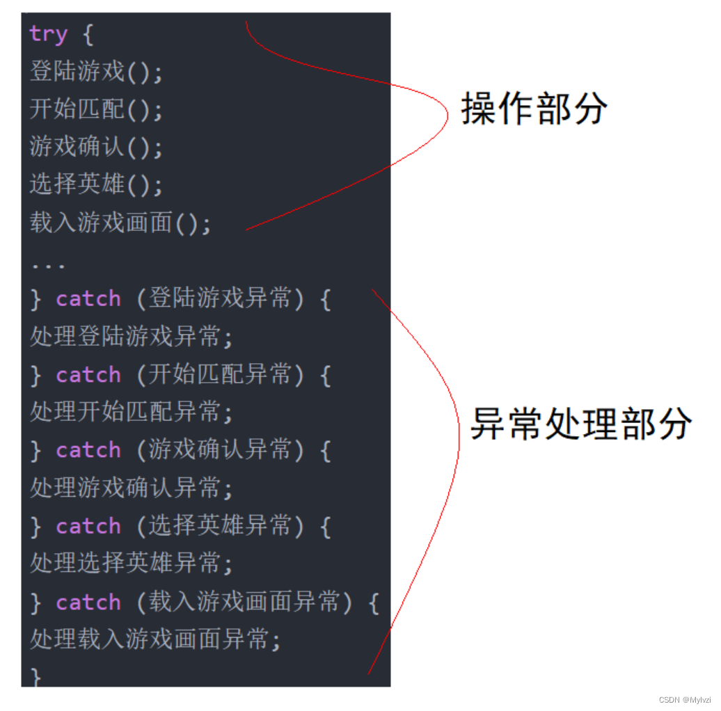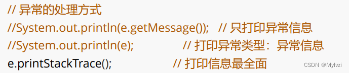 2.catch()存放异常的类型,{}内部存放处理的代码,处理完成后会继续执行后续代码;如果没有捕获到异常,则catch里的语句并不会被执行