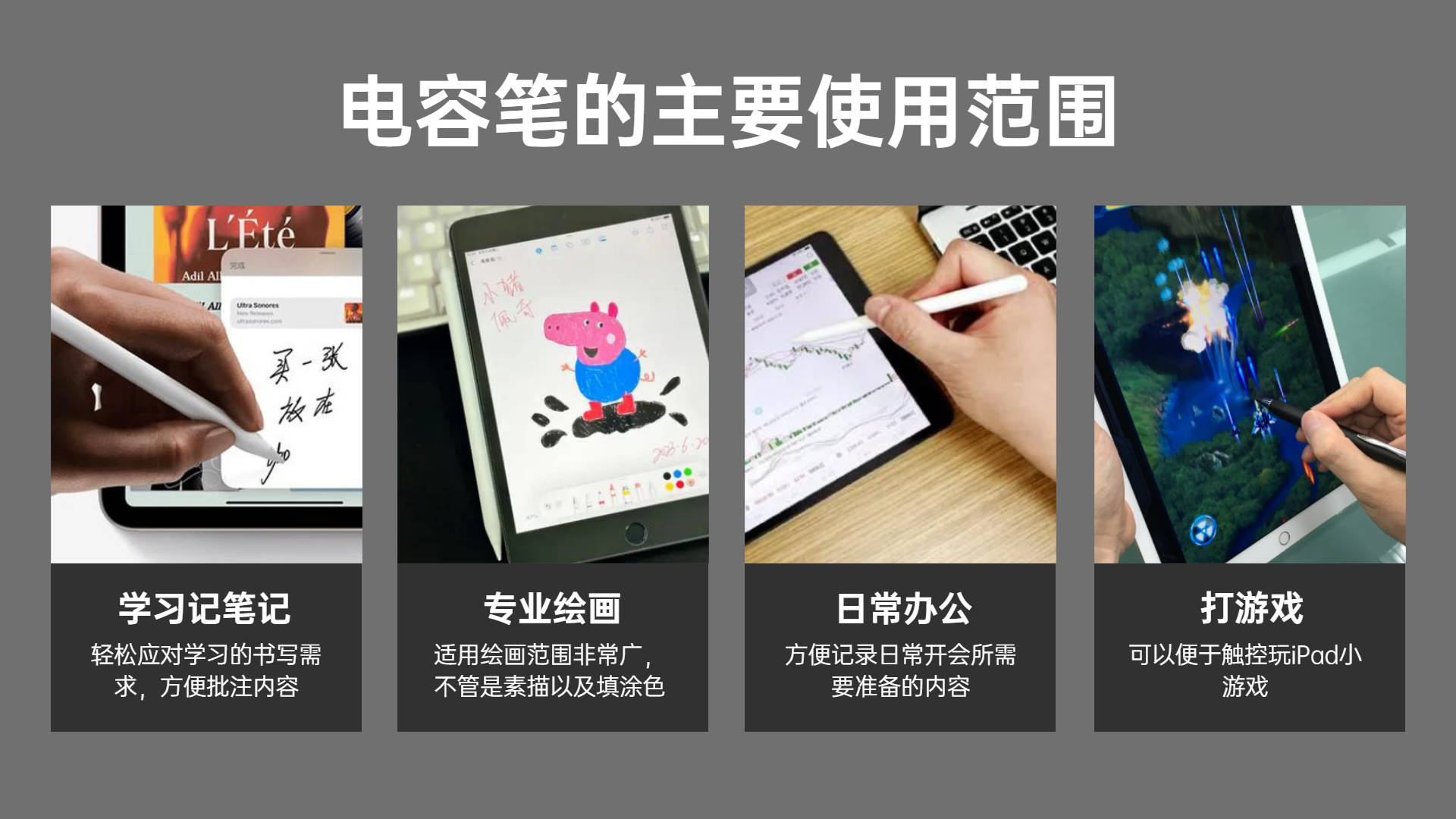 电容笔的使用范围是十分的广泛,在教学方面,电容笔能更好地帮助学生做好笔记,提高教学效率;在绘画方面上,电容笔拥有着先进的压感功能,能够轻易的实现线条的粗细度变化,更好地完成填涂色彩等等。