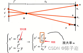 当摄像机中心到像平面的距离无限远时,空间点和像平面点的坐标呈1:1的比例关系。