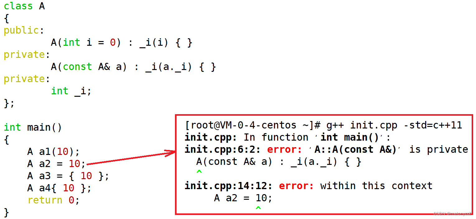 A(int i = 0)构造出一个匿名对象,然后通过这个匿名对象调用拷贝构造函数A(const A& a)构造出 a2,但由于拷贝构造函数是私有的(private),所以编译器会报错。注意:Linux 中的 g++ 编译器会报错,VS 中的编译器则不会报错。