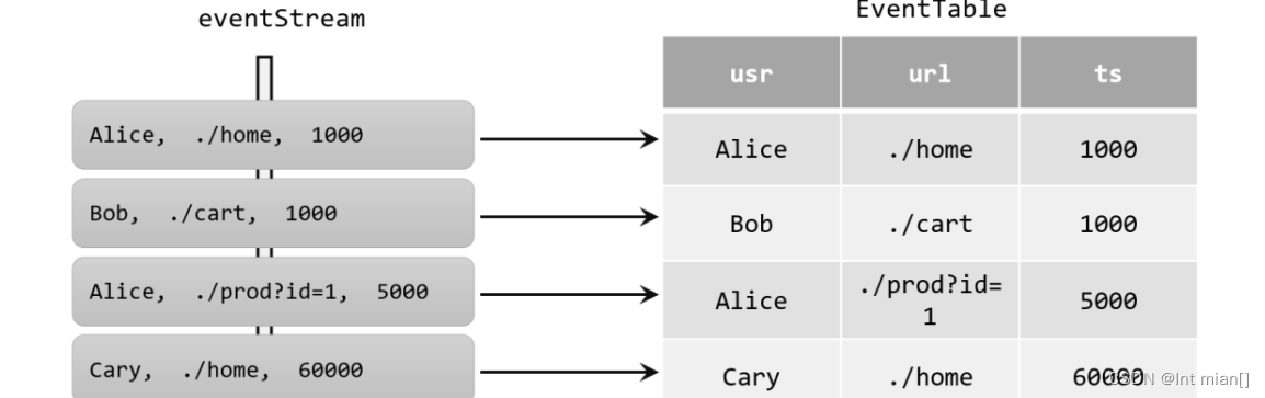 如果把流看作一张表,那么流中每个数据的到来,都应该看作是对表的一次插入(Insert)操作,会在表的末尾添加一行数据。因为流是连续不断的,而且之前的输出结果无法改变、只能在后面追加;所以我们其实是通过一个只有插入操作(insert-only)的更新日志(changelog)流,来构建一个表。