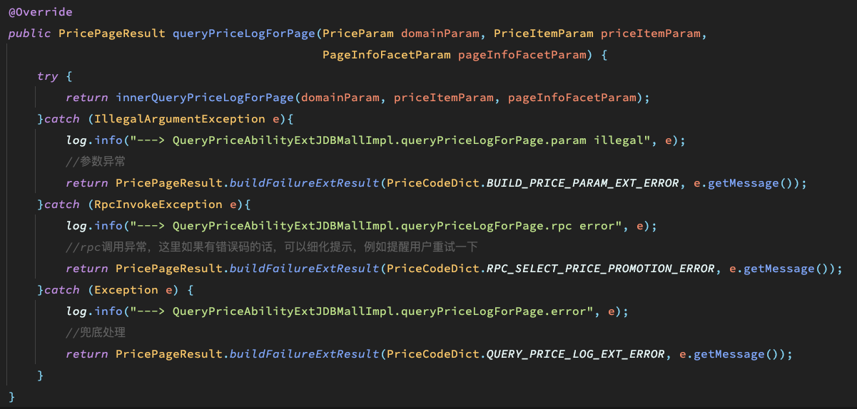 2. 如果确实需要对整段方法进行tryCatch,不如新写一个方法,将业务逻辑处理和异常处理区分开来。