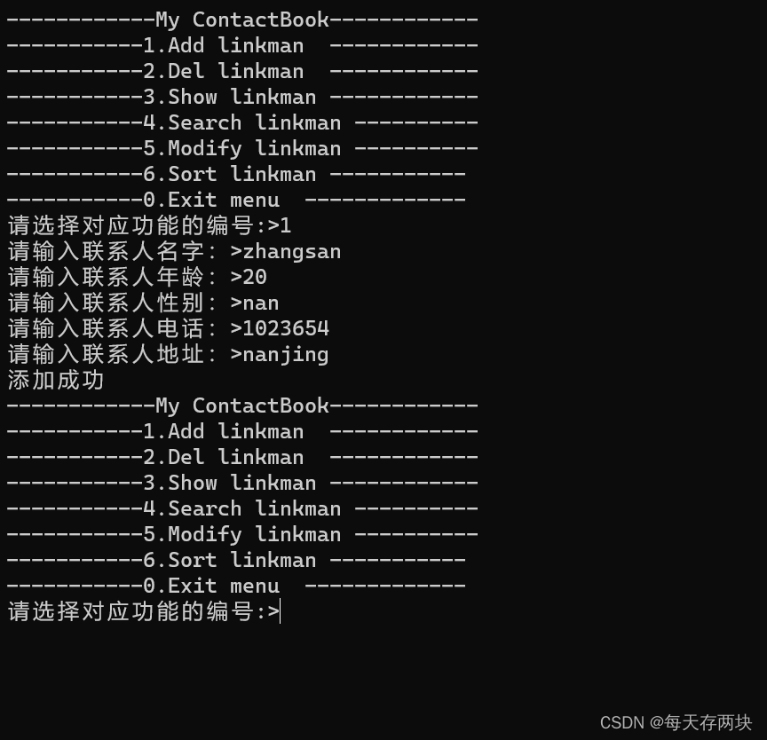 11.保存联系人到相对路径“contact.txt”中,通过二进制进行输入输出,退出时保存,打开时读取。