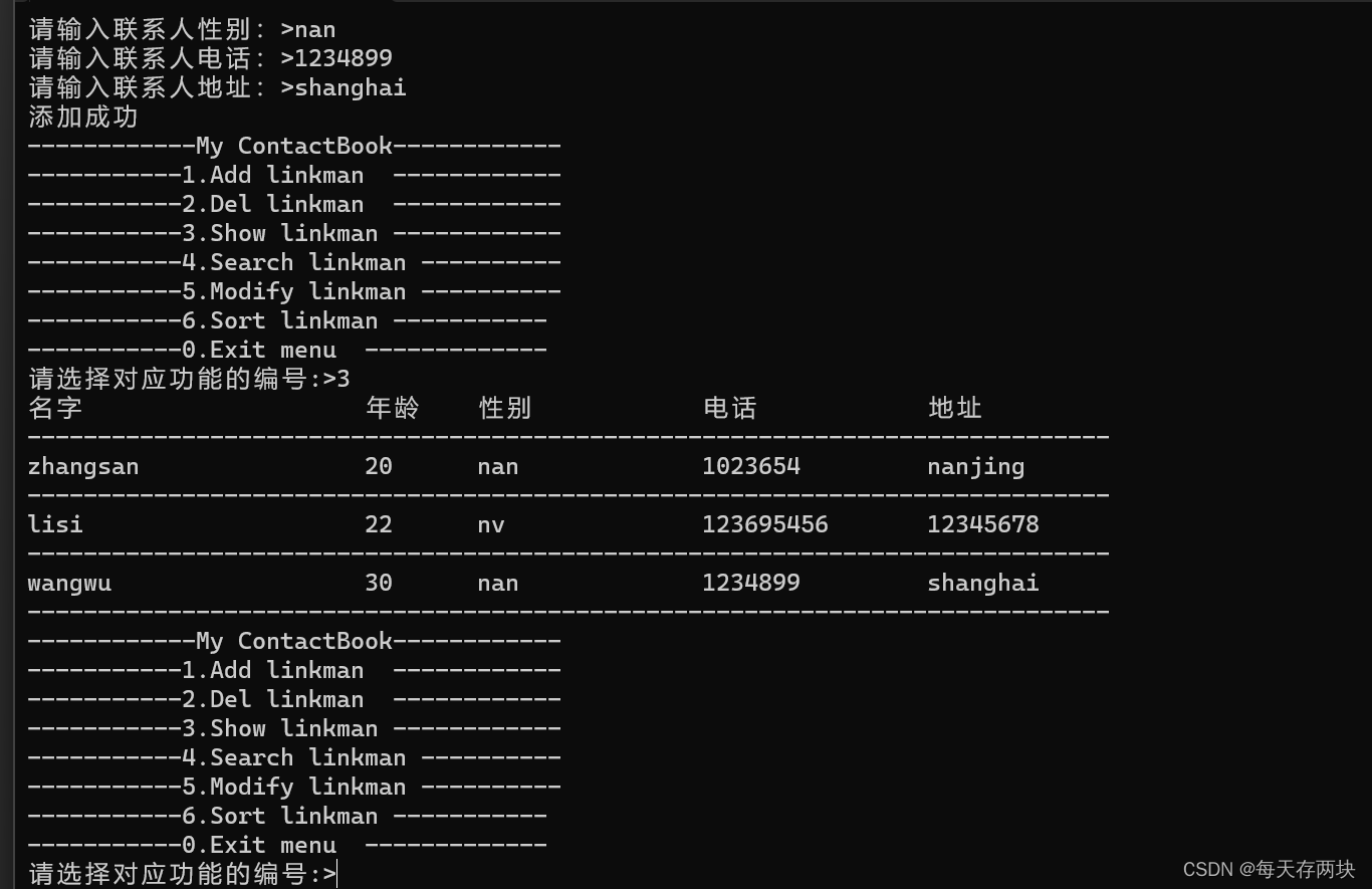 5. 显示联系人(记得格式化),通过for循环标准输出: