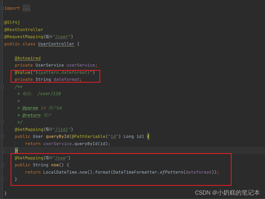 ③在user-service中将pattern.dateformat这个属性注入到UserController中做测试