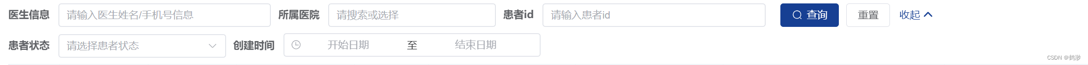 因为要考虑布局,所以使用的是col来控制布局,基本上一行放3个搜索框,加一组按钮,按钮有常见的查询,重置,折叠/展开,以及最右侧的业务按钮,比如:导出