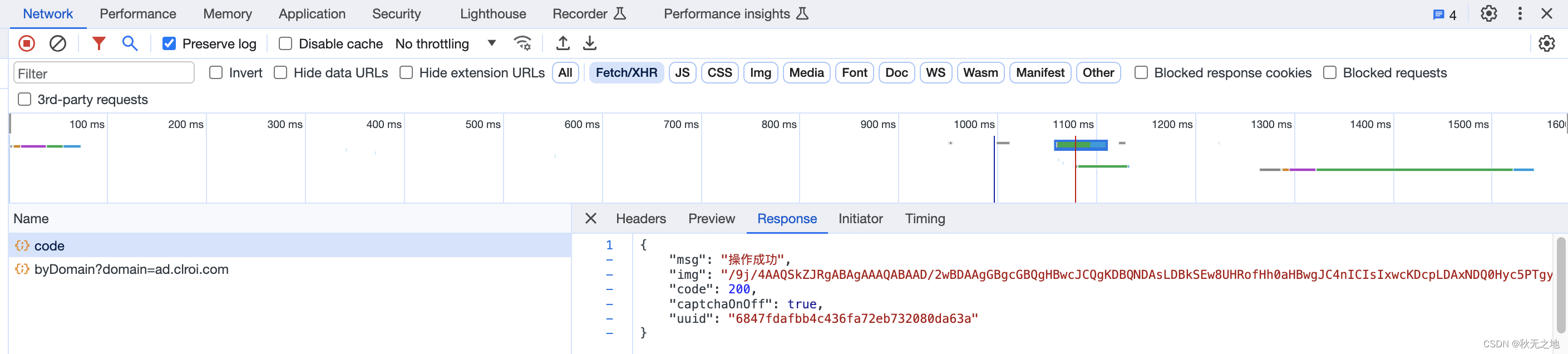打开F12 ,刷新页面可以看到验证码的生成接口,返回的是验证码的图片信息和一个uuid的参数