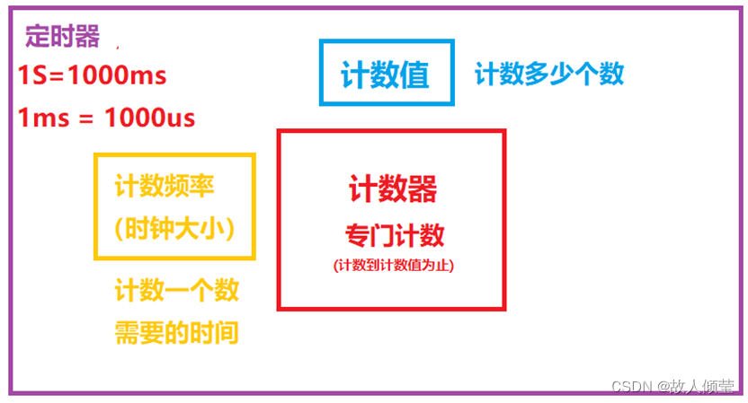 定时器概念:由时钟源+计数器+计数值组成的计数单元。