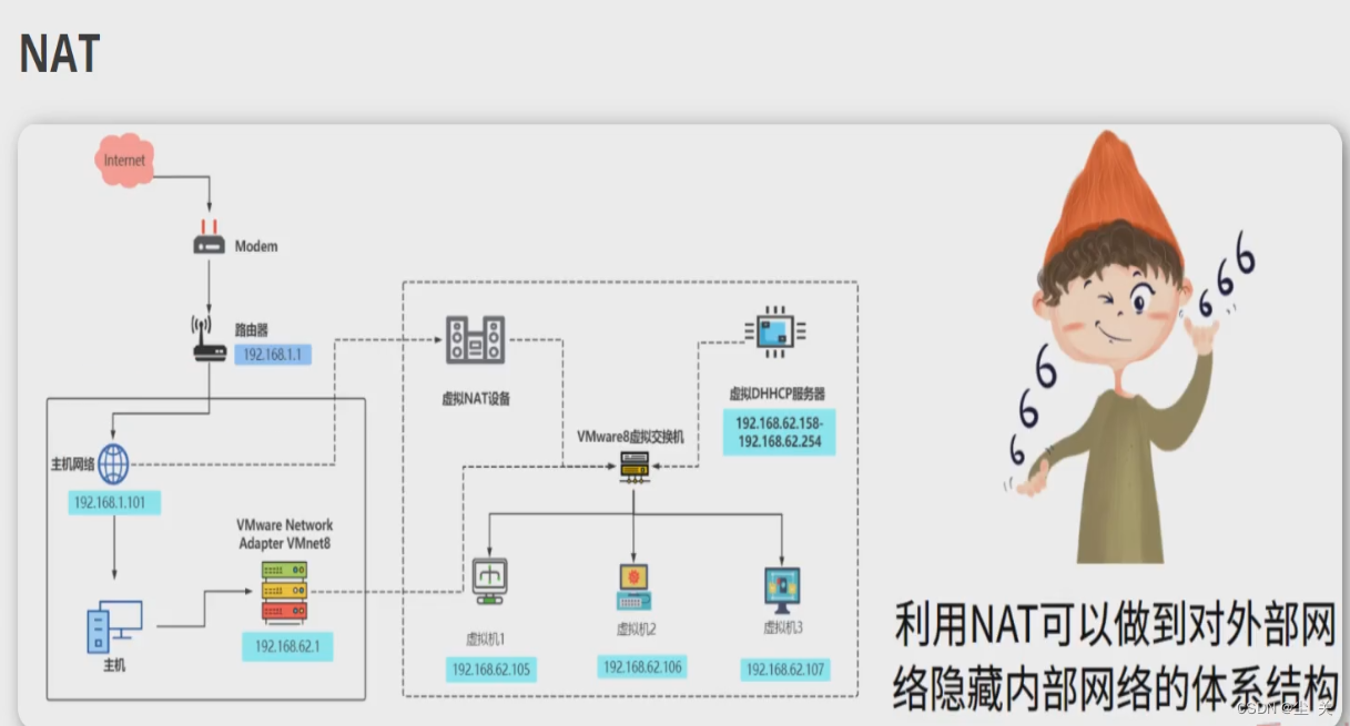 在NAT模式中,物理主机网卡直接与虚拟NAT设备相连,然后,虚拟NAT设备与虚拟DHCP服务器一起连接在虚拟交换机VMnet8上,这样就实现了虚拟机联网。VMware Network Adapter VMnet8虚拟网卡主要是为了实现物理主机与虚拟机之间的通信。