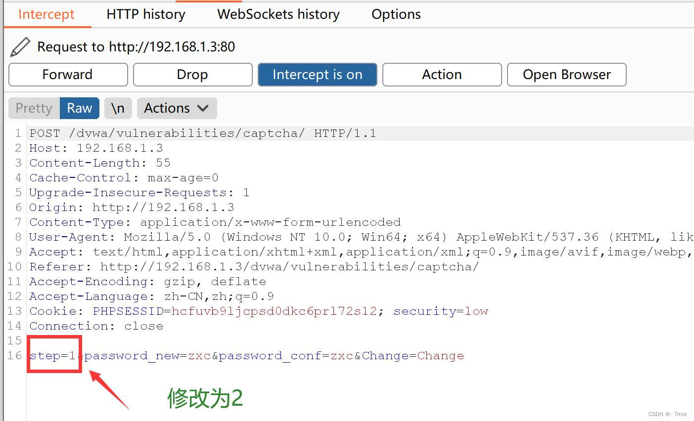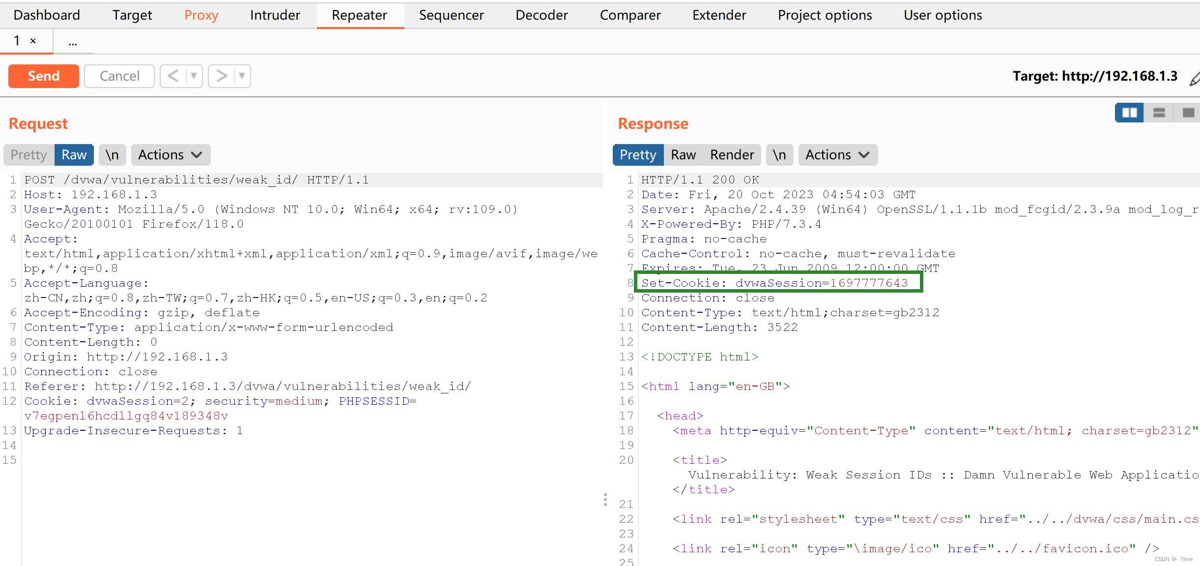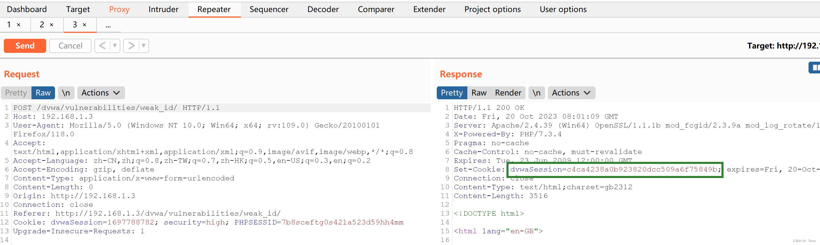 low级别未设置过滤,直接用bp抓包,可以清楚的看到dvwaSesion的cookie,每重放一次,dvwaSesion增加一: