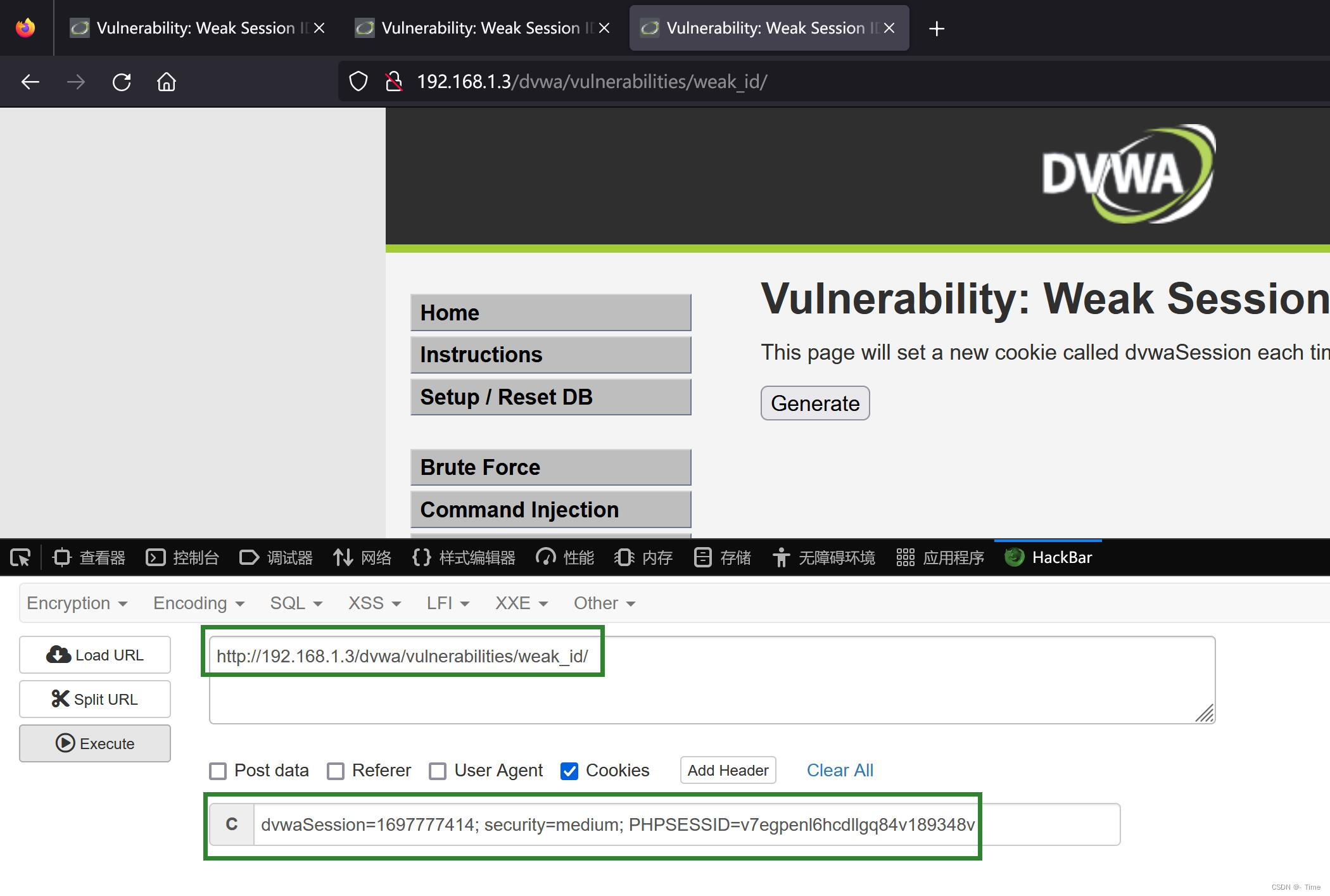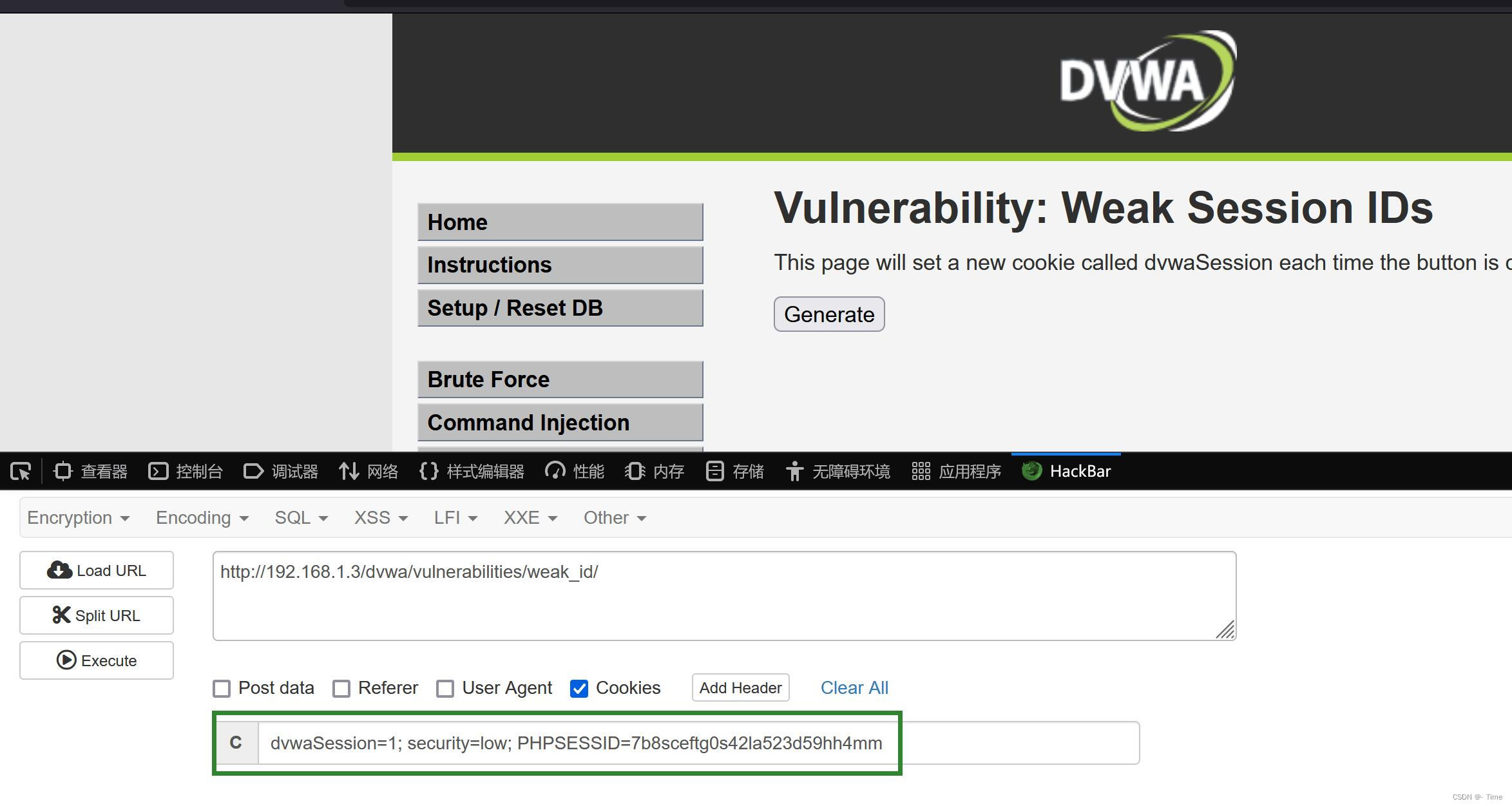 Weak Session IDs(弱会话),用户访问服务器的时候,一般服务器都会分配一个身份证 session id 给用户,用于标识。用户拿到 session id 后就会保存到 cookies 上,之后只要拿着 cookies 再访问服务器,服务器就知道你是谁了。
