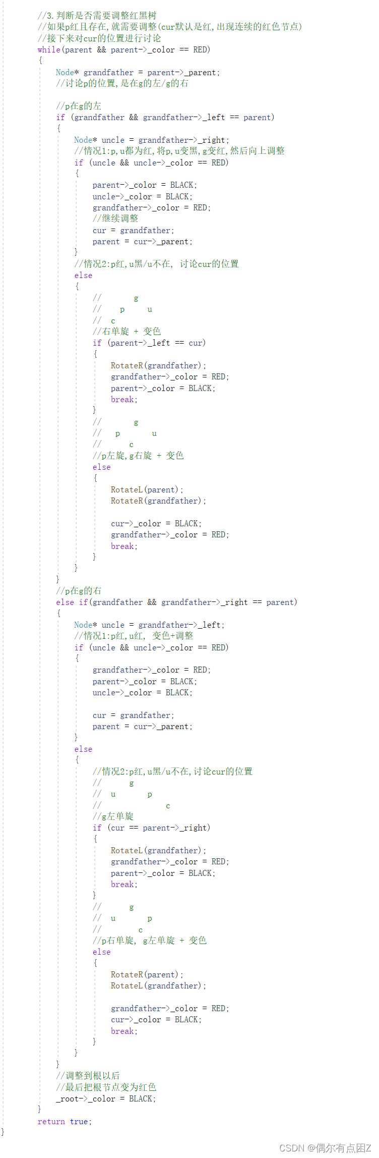 - -当然改为红后,g的p可能也是红,继续往上调整即可(把cur = g),如果最后调到根,要将根变黑