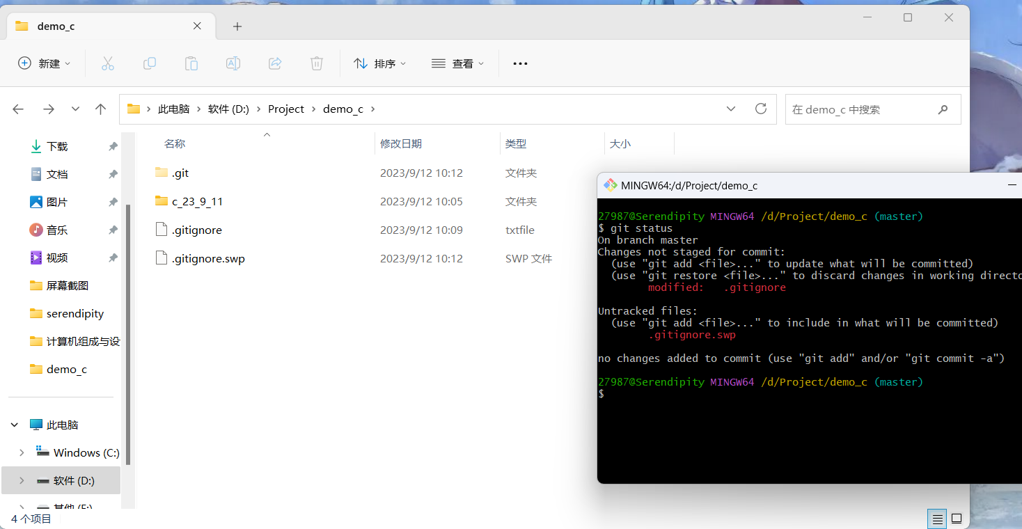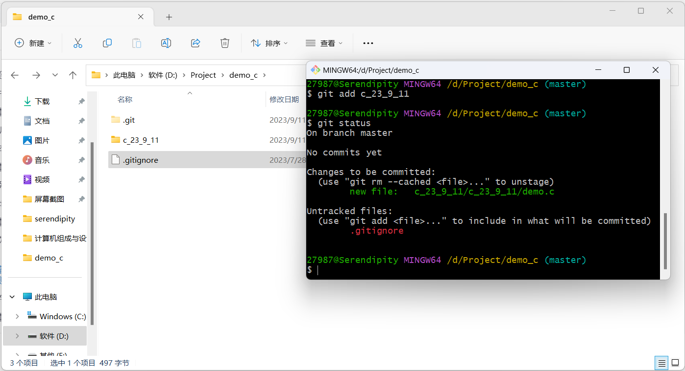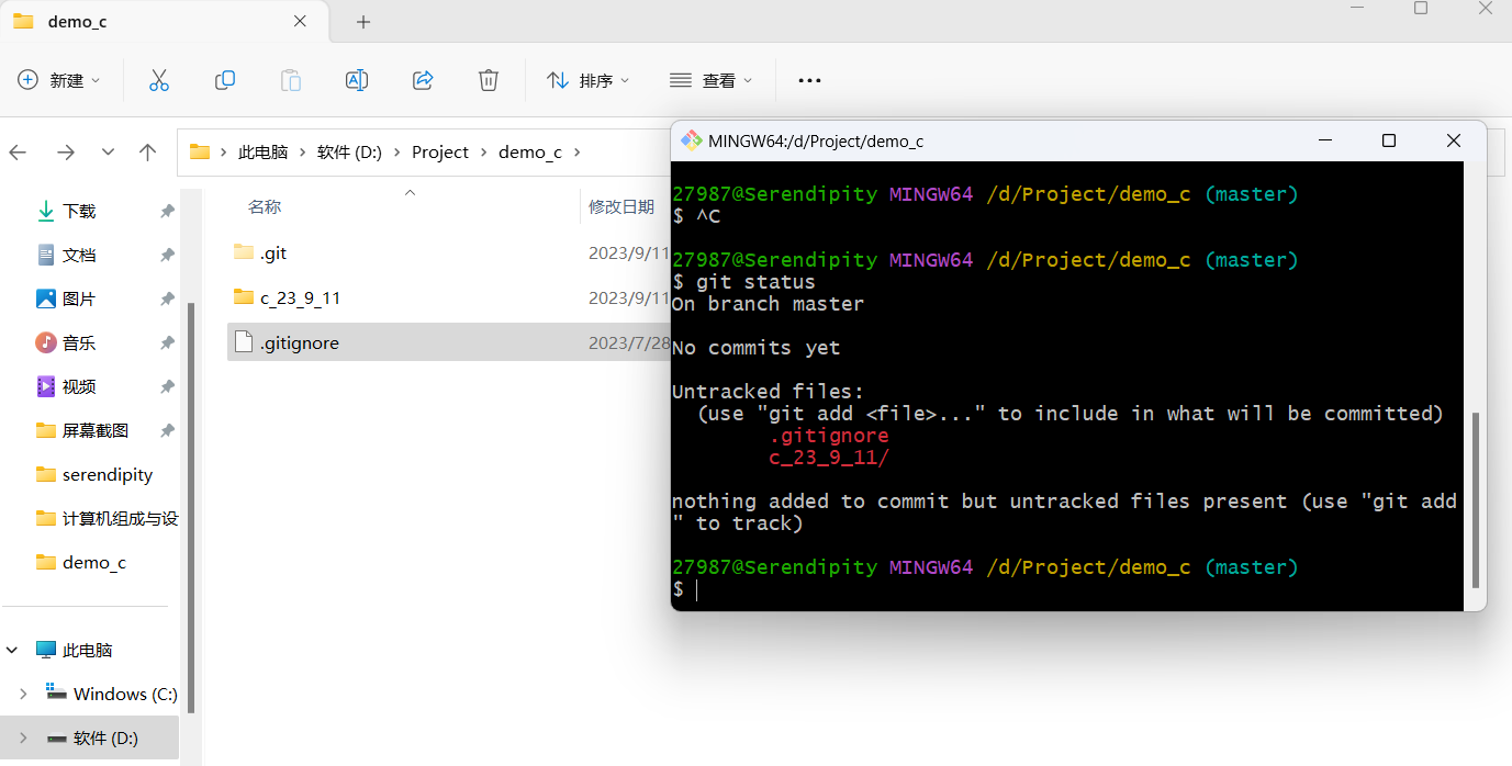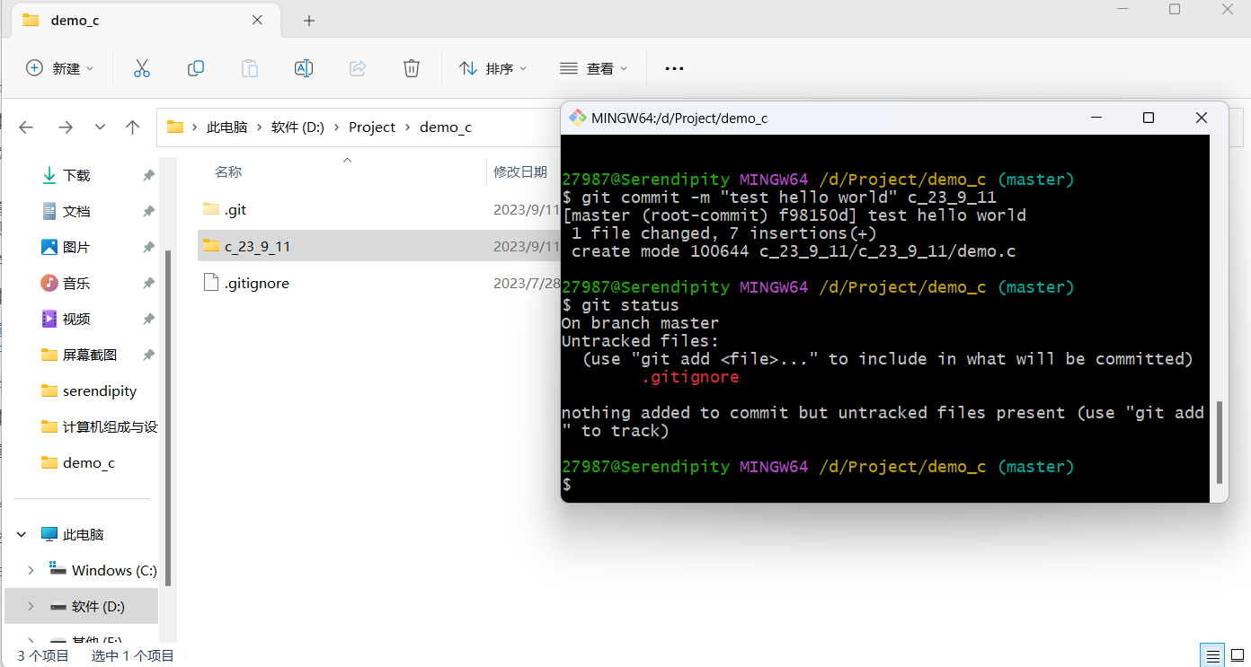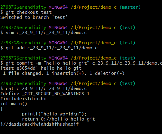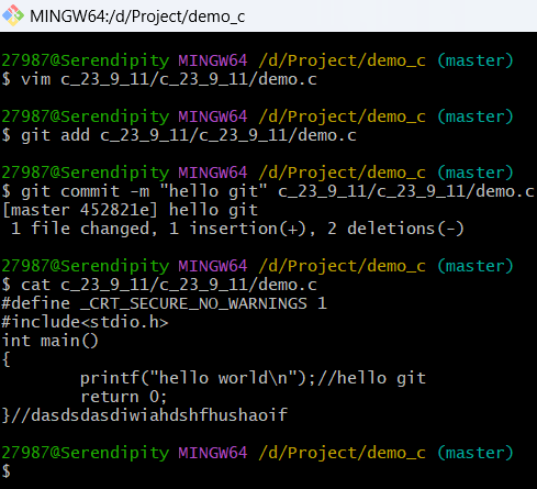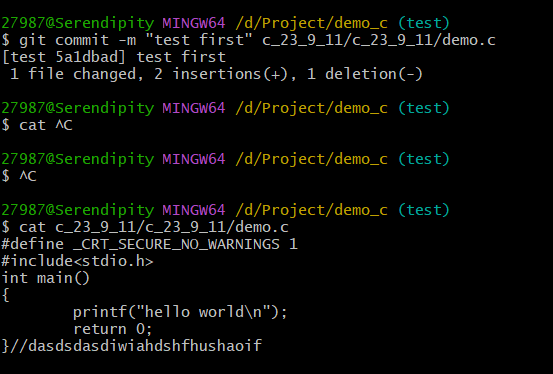 这里我尝试commit时加上了文件名,然后给git报错:不知道commit哪一个分支里面的demo.c