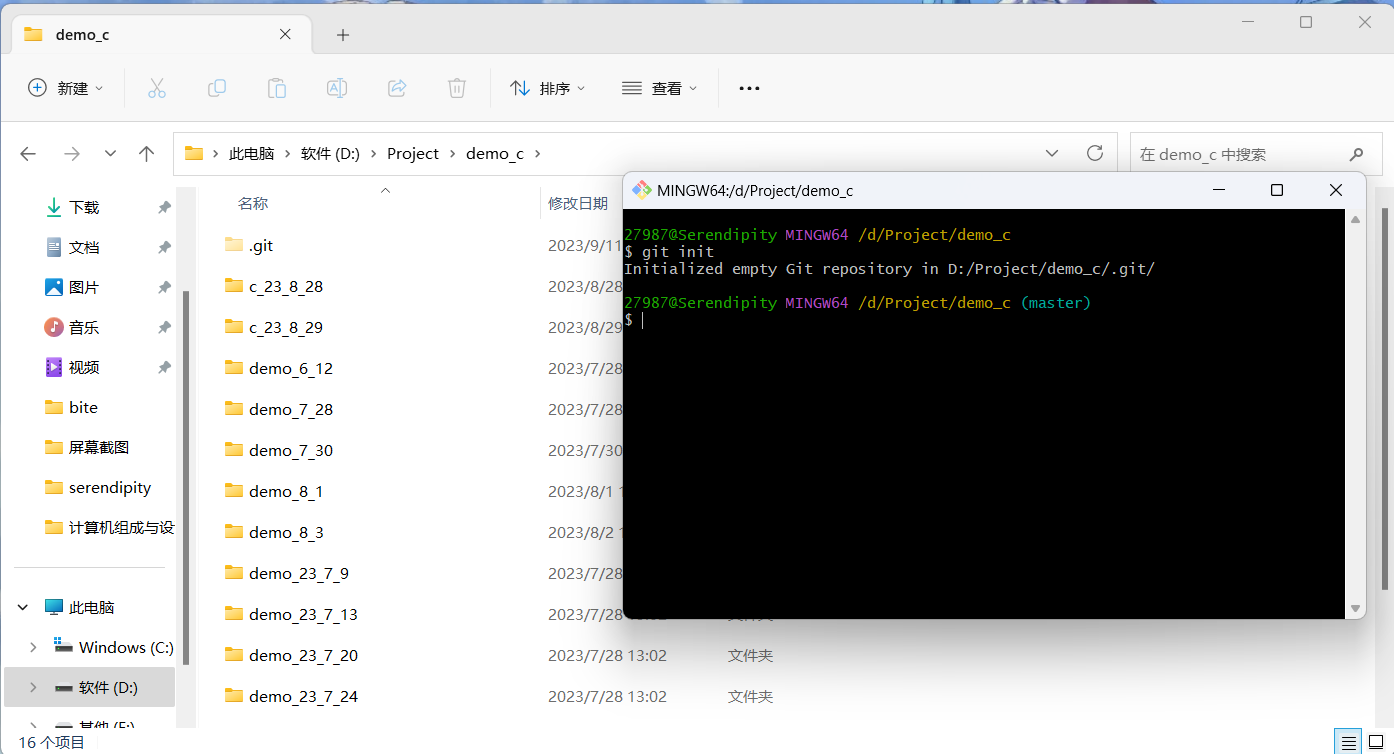 如图,初始化成功后该文件夹就会出现一个 .git 的文件夹。(如果没有,点击文件夹上方查看打开隐藏项目)