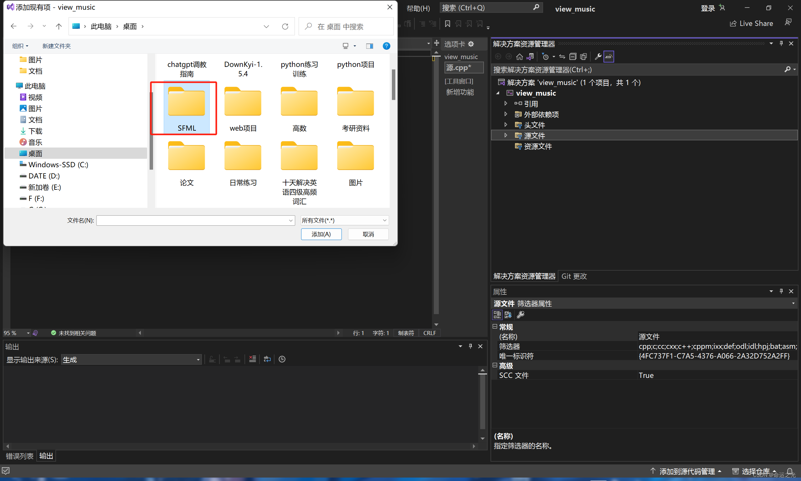 在同样的位置右键单击“源文件”,选择“添加现有项”,并选择 SFML-2.5.1/lib 目录下与编译器相匹配的所有库文件(.lib 或 .a)。例如,如果你使用的是 64 位的编译器,就应该添加 SFML-2.5.1/lib/x64 下的所有库文件。