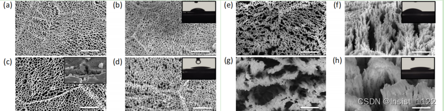 在本研究中,英思特全面地评估了主要的ICP RIE工艺参数对钛上所产生的纳米结构特性的影响。通过系统地改变ICP RIE参数,可以产生具有不同形状、长度、直径、表面润湿性和力学性能的纳米结构。Te蚀刻的形态包括多孔结构和不同直径(26-76nm)、长度(0.5-5.2µm)的纳米孔结构和聚类程度。