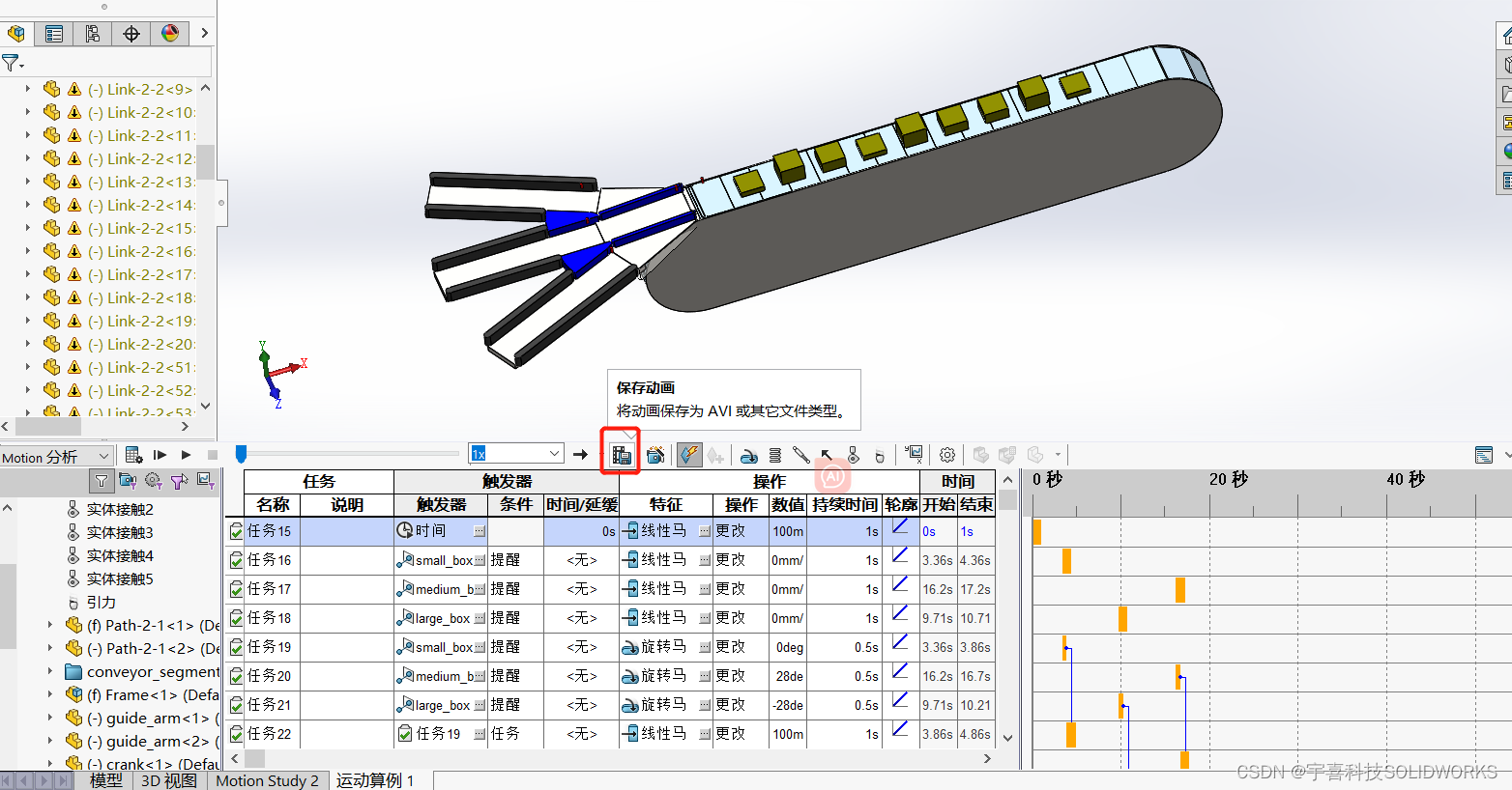 这一次我们来分享一下如何在Solidworks 中做出传送台的分拣动作并通过分拣动作生成过程动画,以便于我们可以用于产品展示又或者验证运行程序无误的情况下结构是否会影响输送效率。