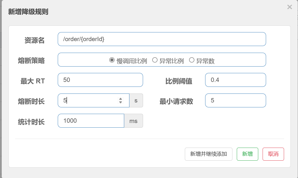异常比例或异常数都是统计指定时间内的调用,如果调用次数超过指定请求数,并且出现异常的比例达到设定的比例阈值(或超过指定异常数),则触发熔断。
