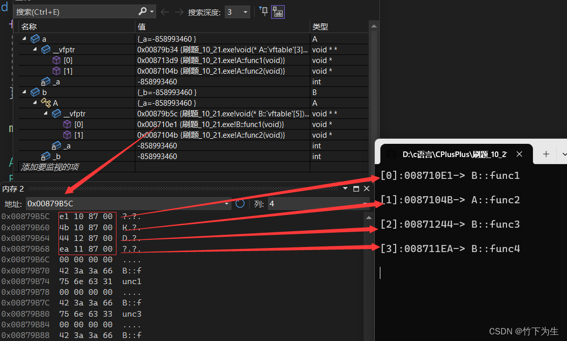 (VS编辑器会在虚函数表的结尾放一个空指针)从内存窗口来看,b的虚函数表确实是存了4个地址,但是我们不能确定,下面我们来验证一下