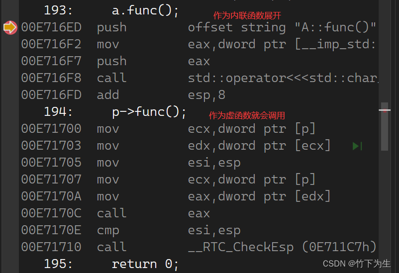 class A { public: inline virtual void func() { cout << "A::func()"; } }; int main() { A a; A* p = new A; a.func(); p->func(); return 0; }![]()