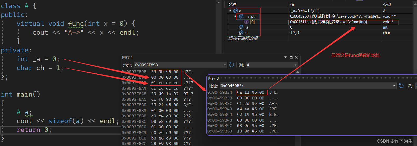哎?为什么这是12呢,正常我们用内存对齐来算的结果应该是8才对呀,这个类和之前的类的唯一区别在于它多了一个虚函数,我们就猜测类里面来应该存了func这个函数的相关信息。