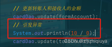 在引发异常后是不是并没有扣除转账人的余额了,因为使用事务管理,在引发异常时,就会终止这个流程,只要引发异常就不会再执行下去了。一句话总结: