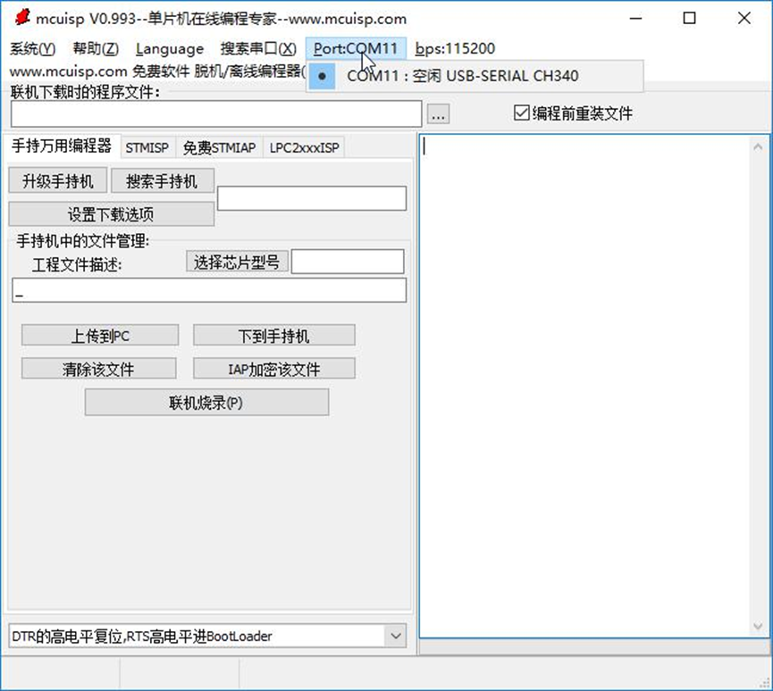5) 在界面选择对应的串口和波特率。(在这里示例端口为 COM11,每台电脑可能会不一样,根据自身电脑选择即可,端口如果出现 COM1,一般为系统通信端口,并非开发板的实际端口,波特率选择 115200,请勿更改。)