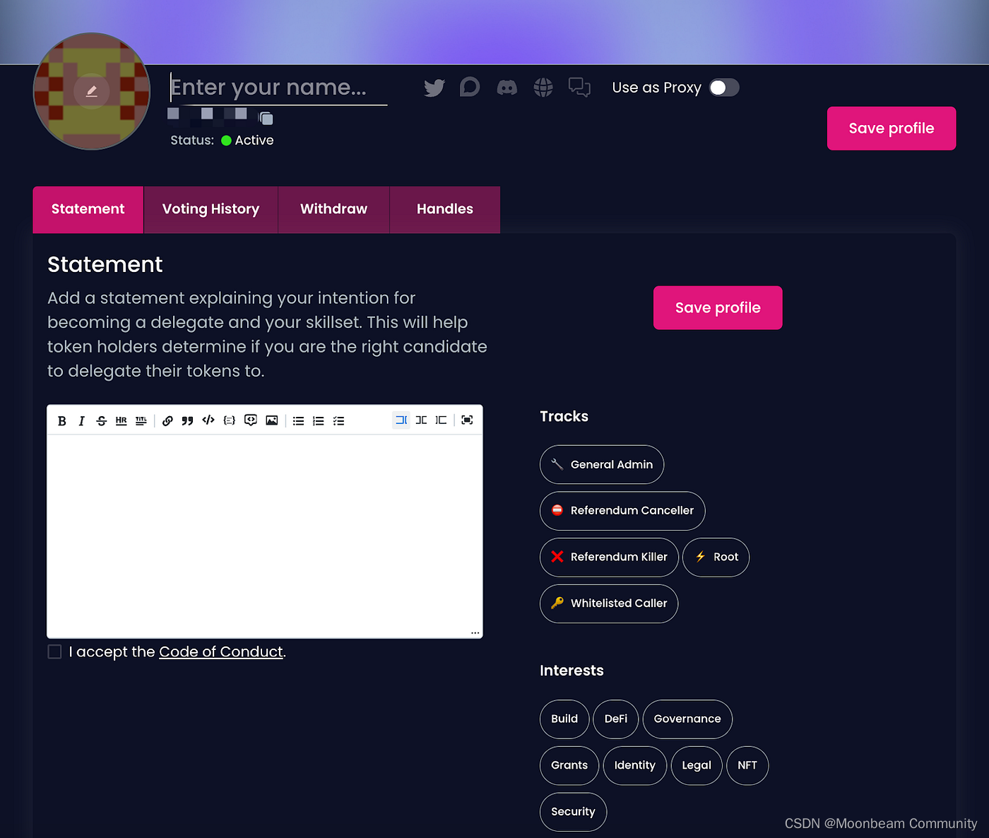 接下来,点击“Edit Profile”进入个人信息编辑页面,输入您想要与社区成员分享的相关信息,包括成为社区代表/专家的说明(自我介绍)、选择想要委托的track类型,另外您也可以分享您的个人兴趣。