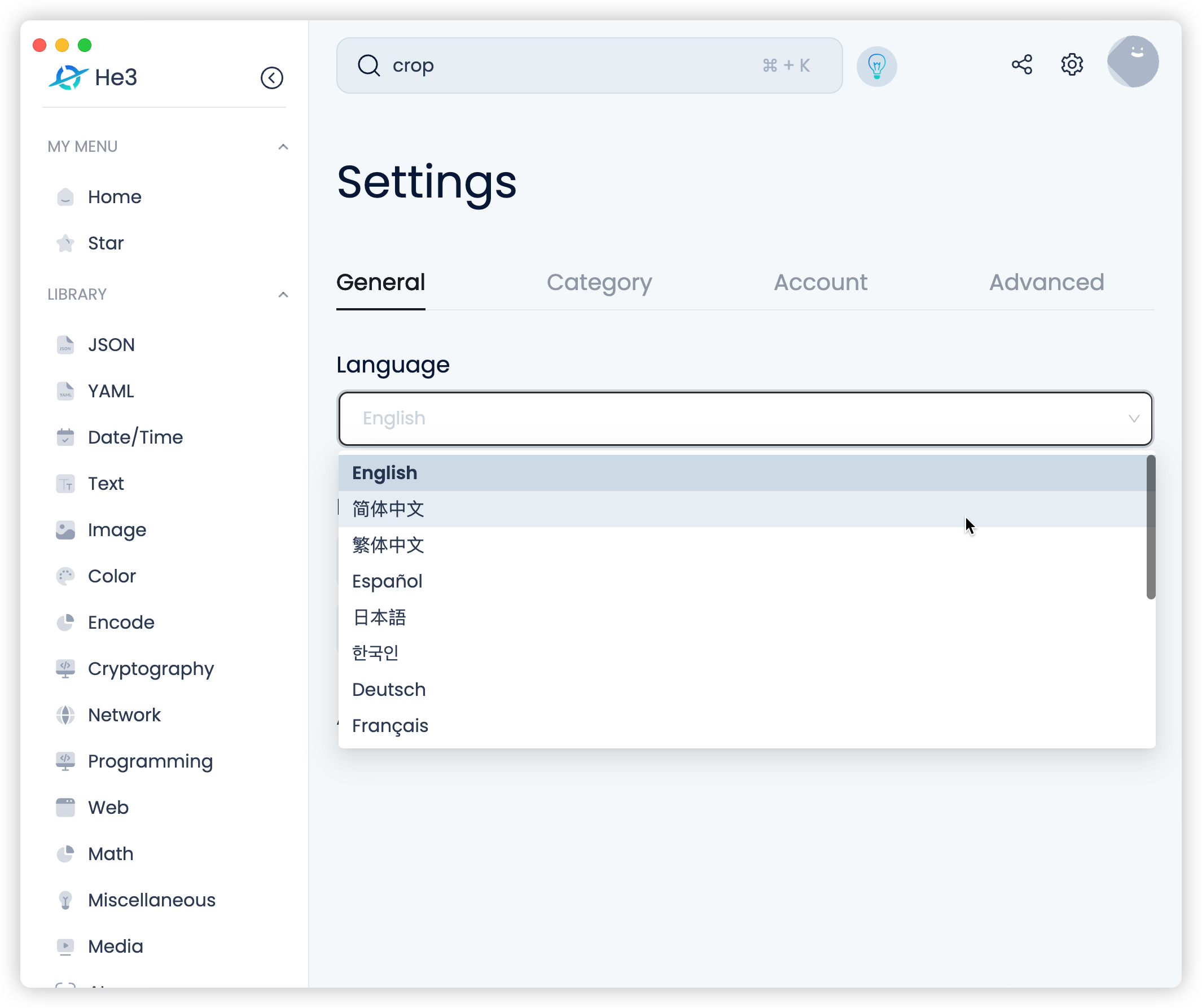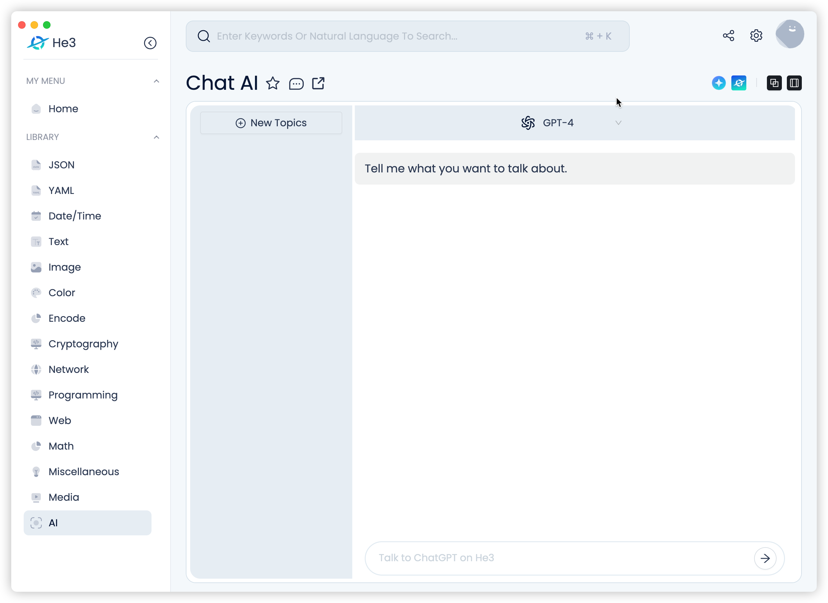 He3 有丰富多样的工具,有开发相关的,比如 JSON、YAML、加解密、网络、Web 相关等等,有多媒体处理,比如图片视频处理、证件夹、背景消除等等,也有 AI 相关工具,比如 Chat AI 、文字转语言等等等等: