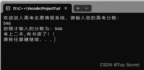 - cout << "考上二本,有书读了!!" << endl;