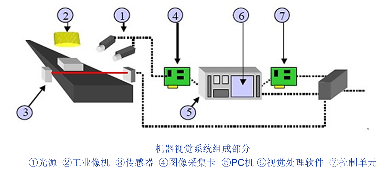 计算机视觉系统的构成主要包括光源、工业相机与工业镜头、传感器、图像采集卡、PC平台和视觉处理软件部分,具体功能如下: