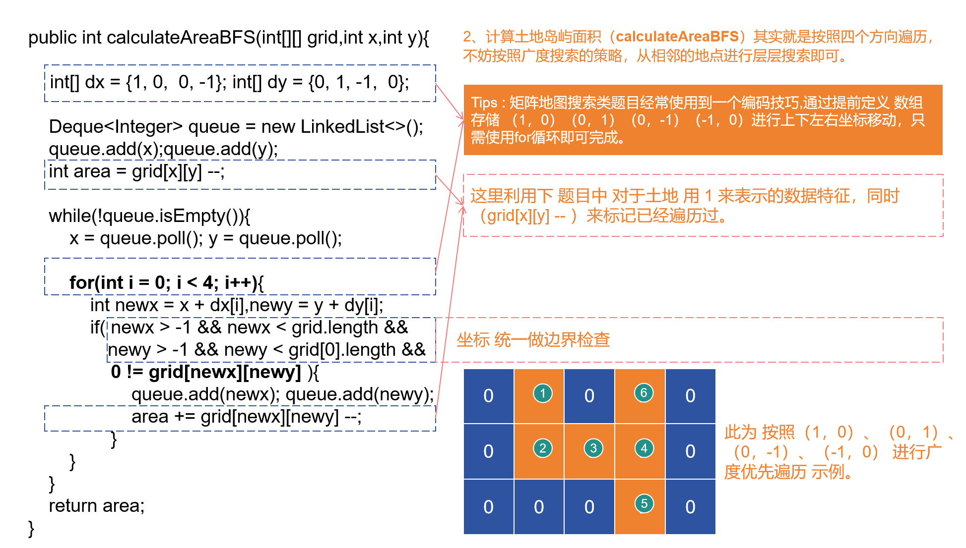 - 广度优先搜索(Breadth First Search)的基本应用,通常使用队列数据结构来实现。