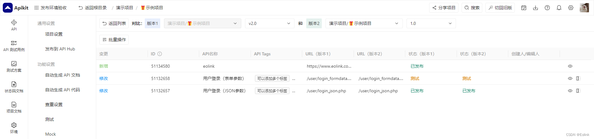 Eolink Apikit 提供项目级的版本管理功能,可以对项目进行打版本,保存一份当前项目所有API文档的快照。以便进行版本对比和分支版本管理。