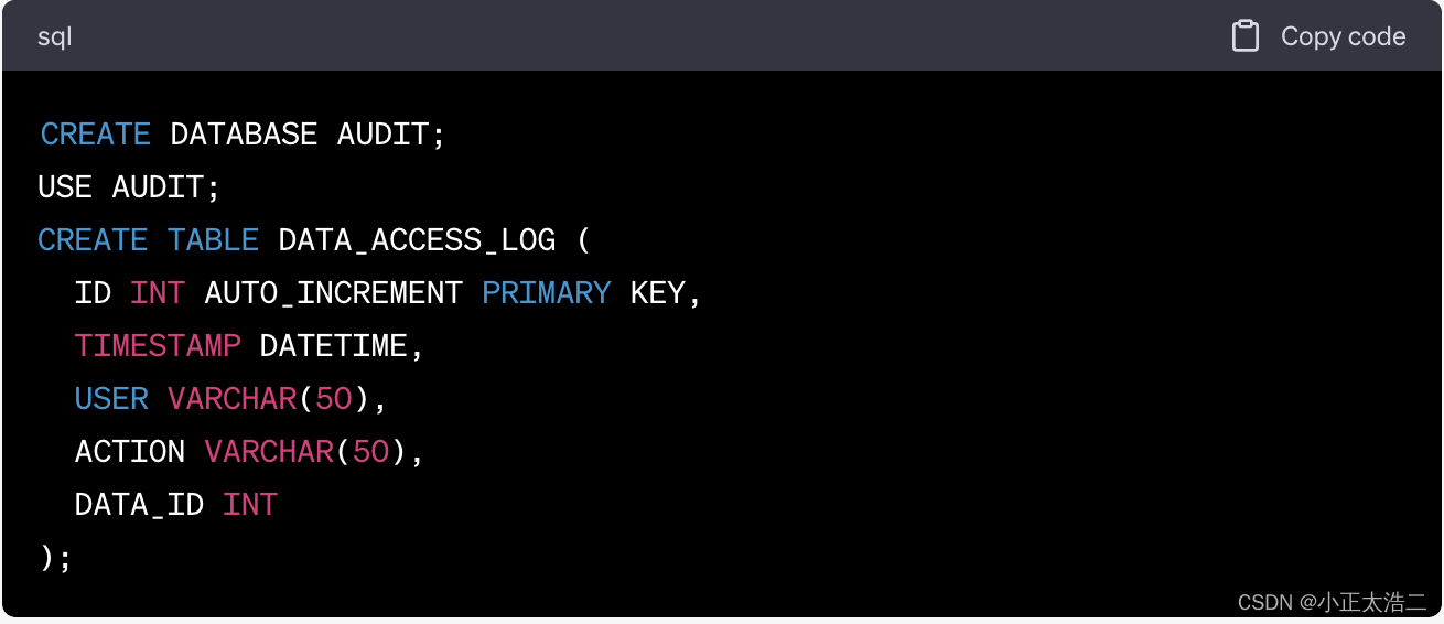 数据审计是确保合规性的关键,它允许跟踪数据的使用和访问历史。例如,使用数据库审计功能来记录数据库操作。