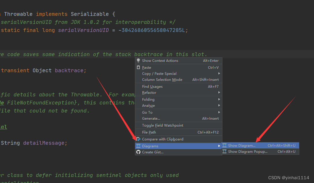 2. 右键Throwable类的代码编辑的空白处,点击Diagrams