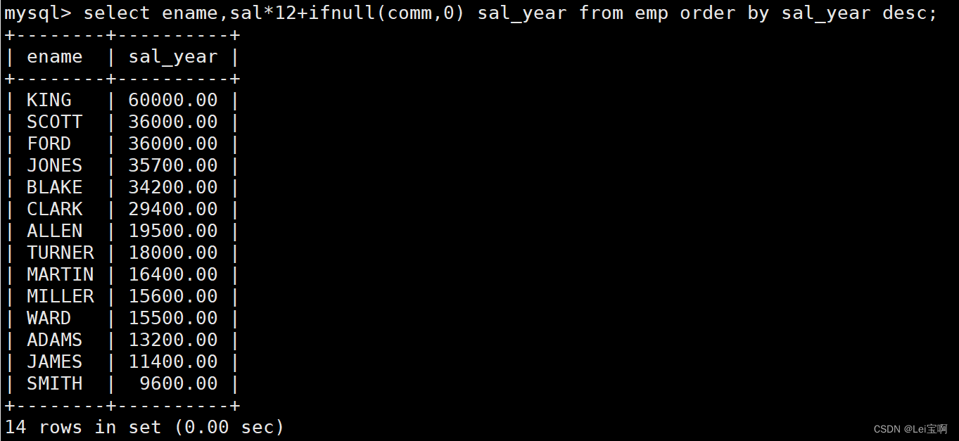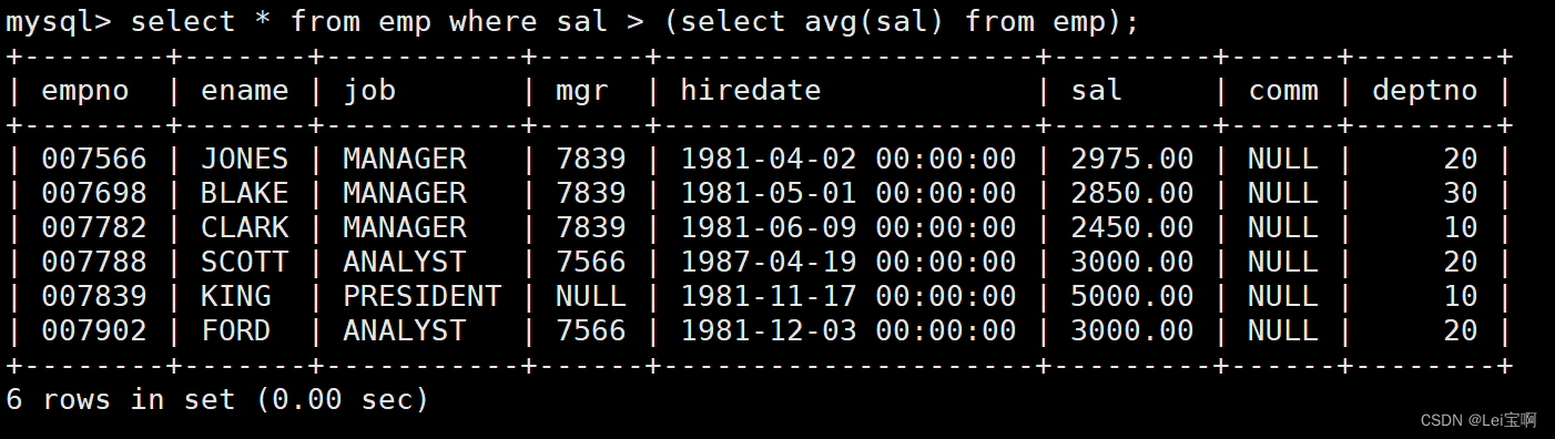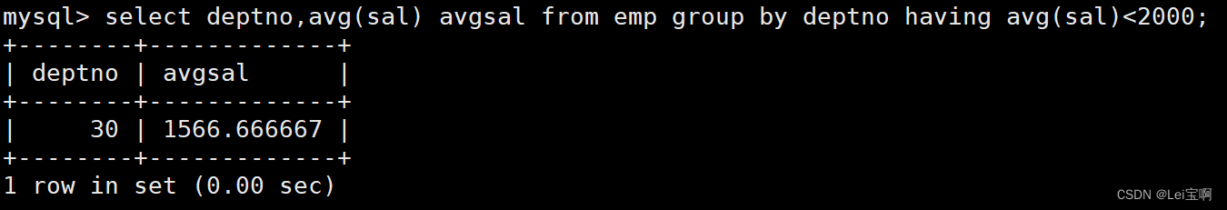 也许你会有疑问,avgsal不是求平均值吗,前面三个数据没有分组,为什么能够做聚合?首先,我们在from那里就已经做出了avgsal的表,而且已经拼接。