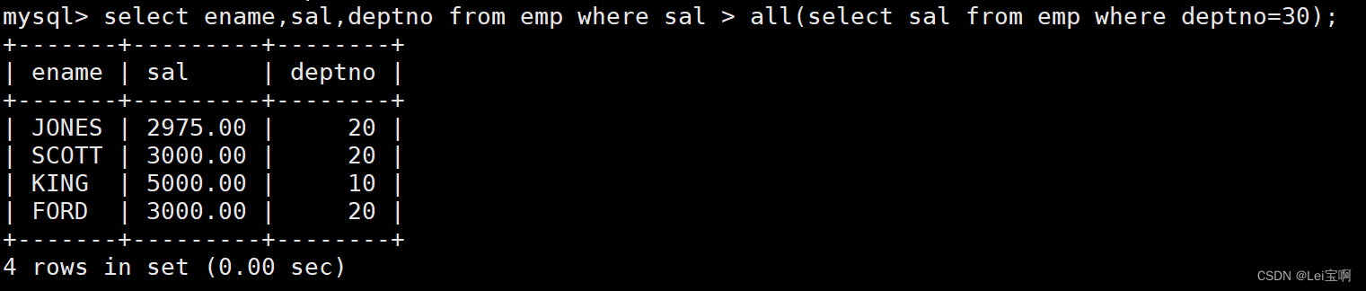 all关键字;显示工资比部门30的所有员工的工资高的员工的姓名、工资和部门号