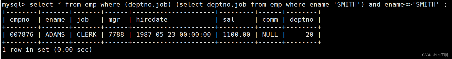 查询和SMITH的部门和岗位完全相同的所有雇员,不含SMITH本人